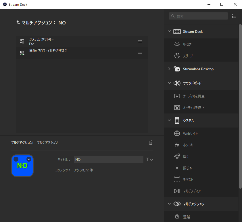 次にこのシャットダウンシーケンス開始ボタンを設置したいプロファイルに戻りマルチアクションでボタンを作成します