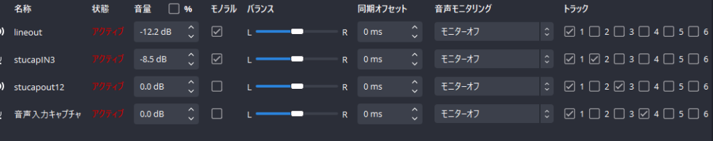 この3つを分けて録音、配信も同時に行うこともできる前提で設定していきます。